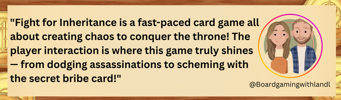 Fight For Inheritance the card game. Build up your Bodyguard defence and bribe, bluff and deceive others to win it all. Can you outlast them all to be the final Heir standing?